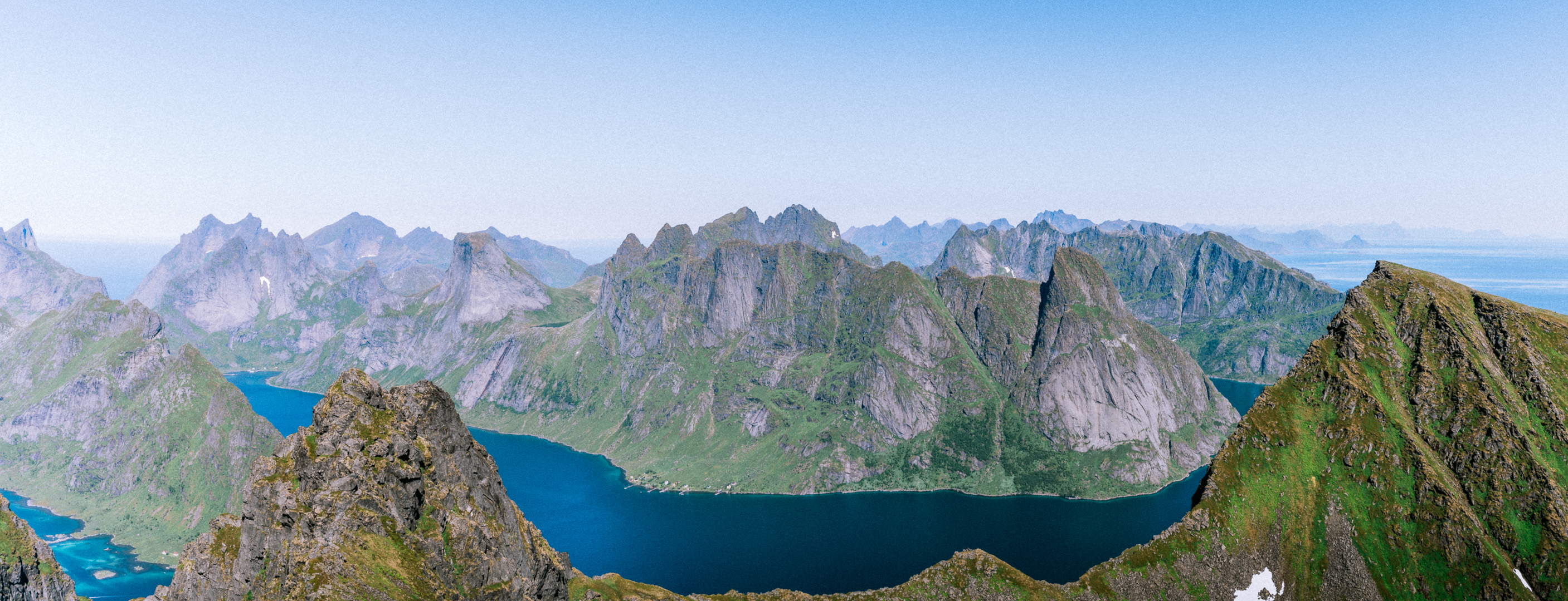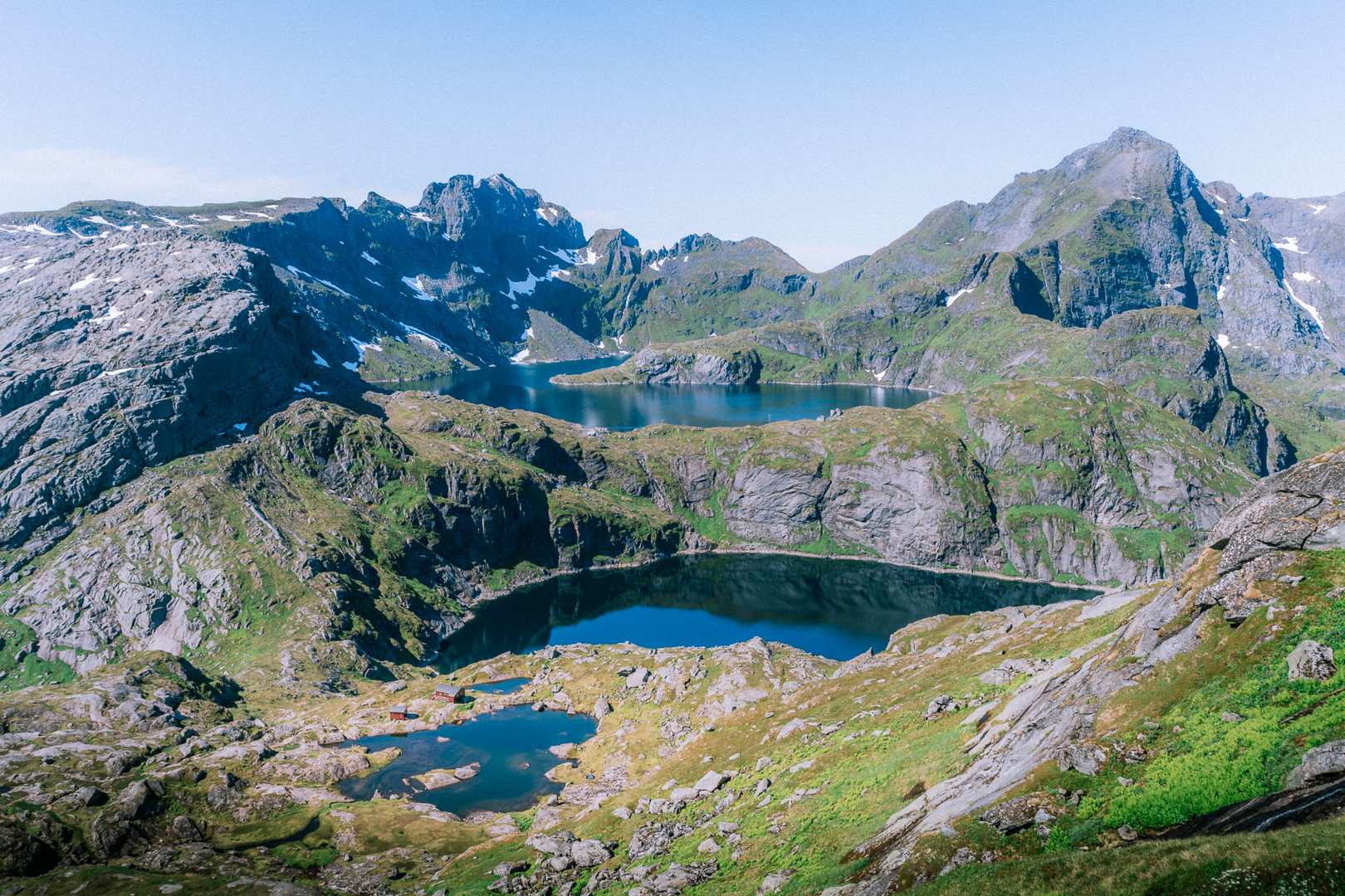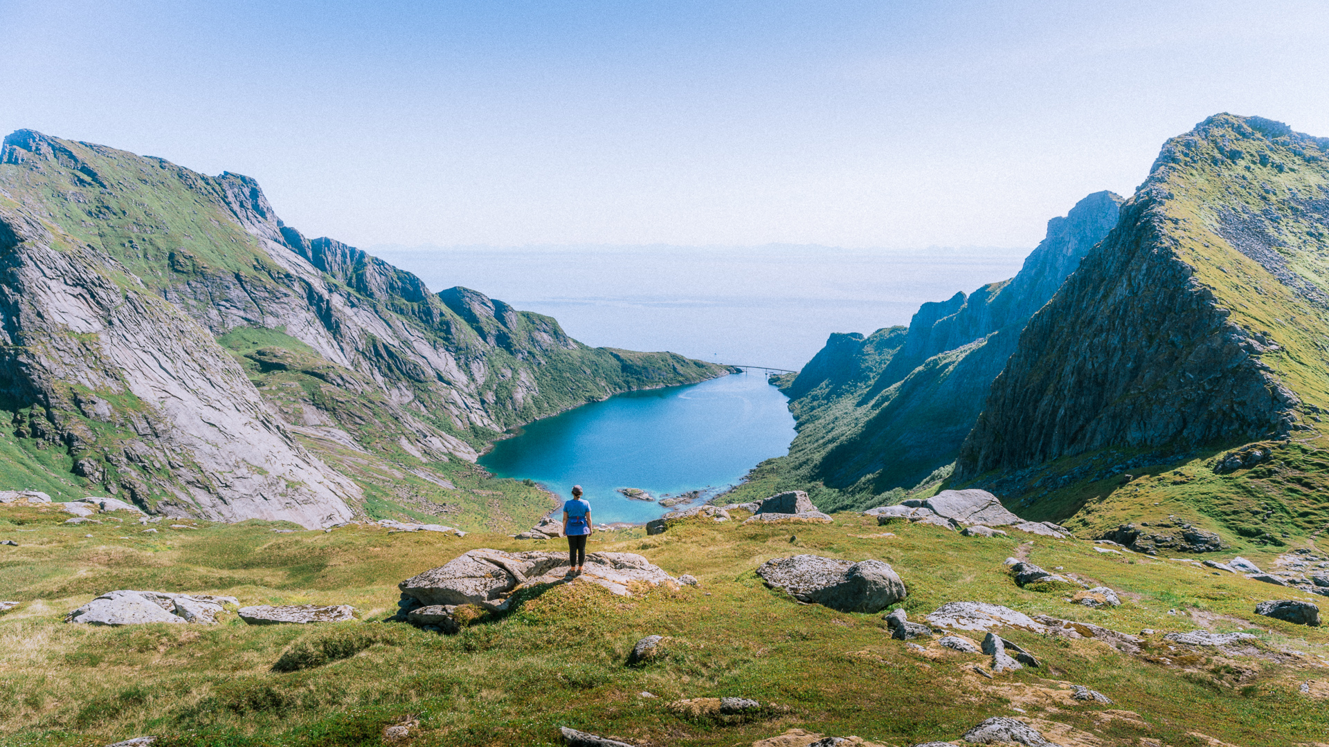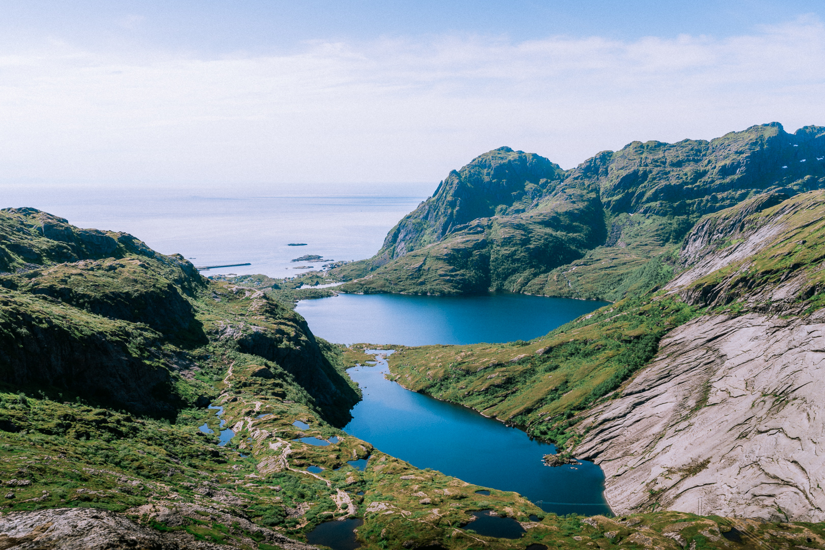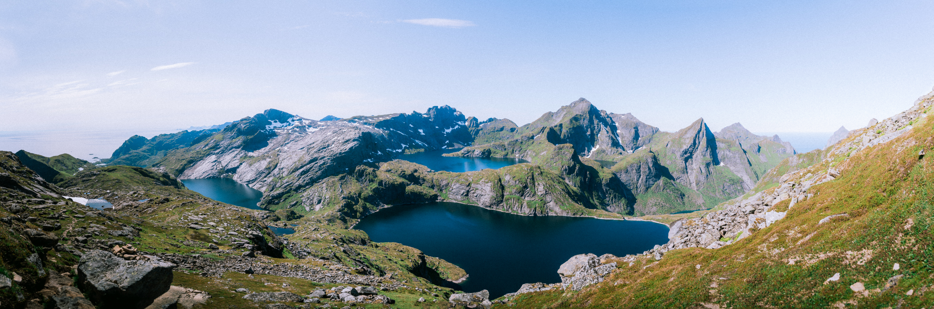 Starting at the village of Sørvågen the trail ascents gently to the waterfall. Thereafter, you follow the shore of Stuvdalsvatnet. You’ll leave the shore behind by ascending some slabs using a set of chains. After this initial first steep part, you’re rewarded with the view on Tridalsvatnet. The trail is a bit flatter for a while. It starts ascending more steeply again when approaching the Djupfordheia. Arriving on top of this first summit gives you an impression of the views to come. Take a breath here and prepare for the final steep part up to the north summit of Munken. It is steep and strenuous, but the 360 panorama is worth it!